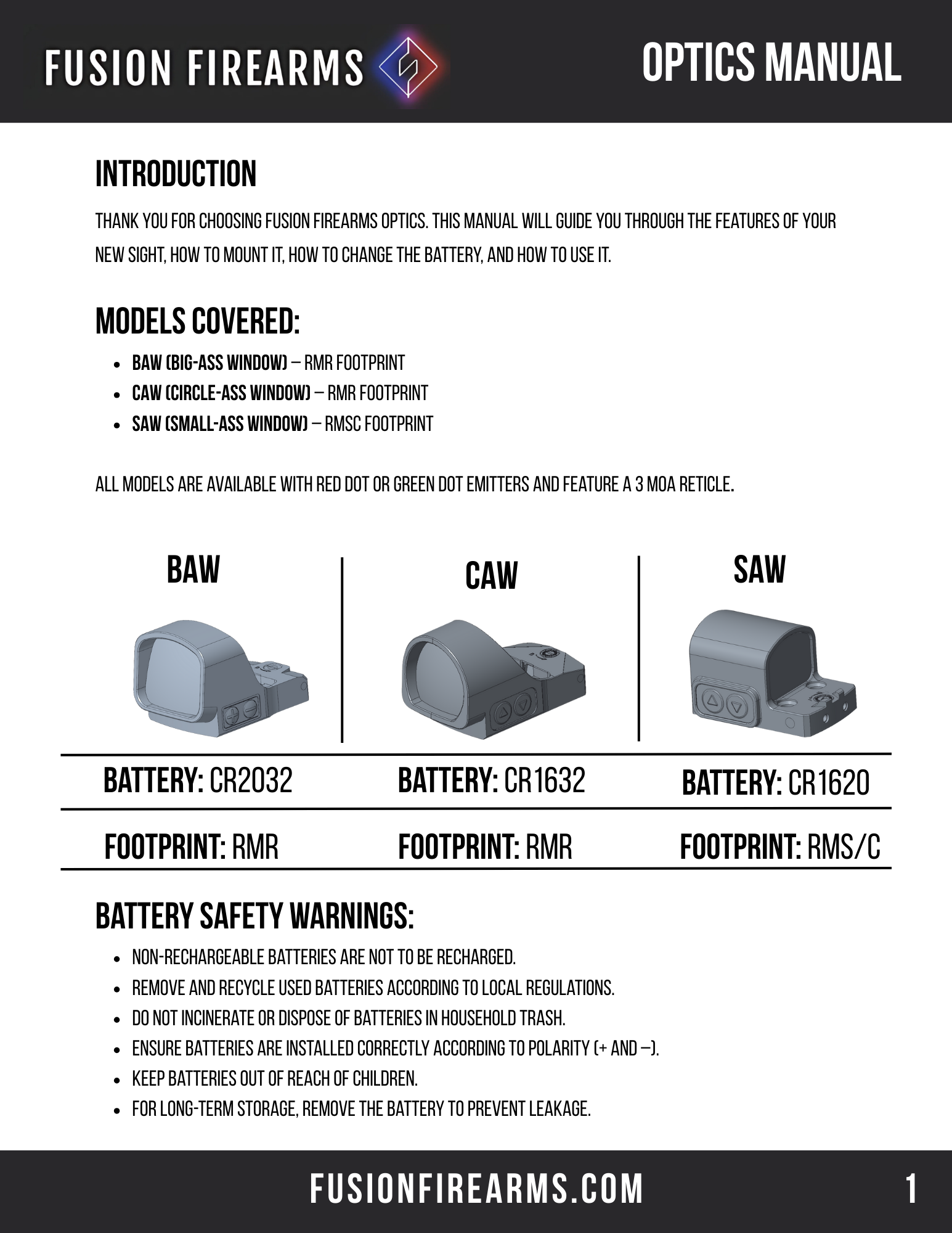 Welcome to the official resource page for Fusion Firearms optics. Whether you’ve chosen the BAW (Big-Ass Window), CAW (Circle-Ass Window), or SAW (Small-Ass Window), this page provides everything you need to get the most out of your new optic. Here you’ll find the user manual, quick-start details, and product images to help you get set up quickly and confidently.