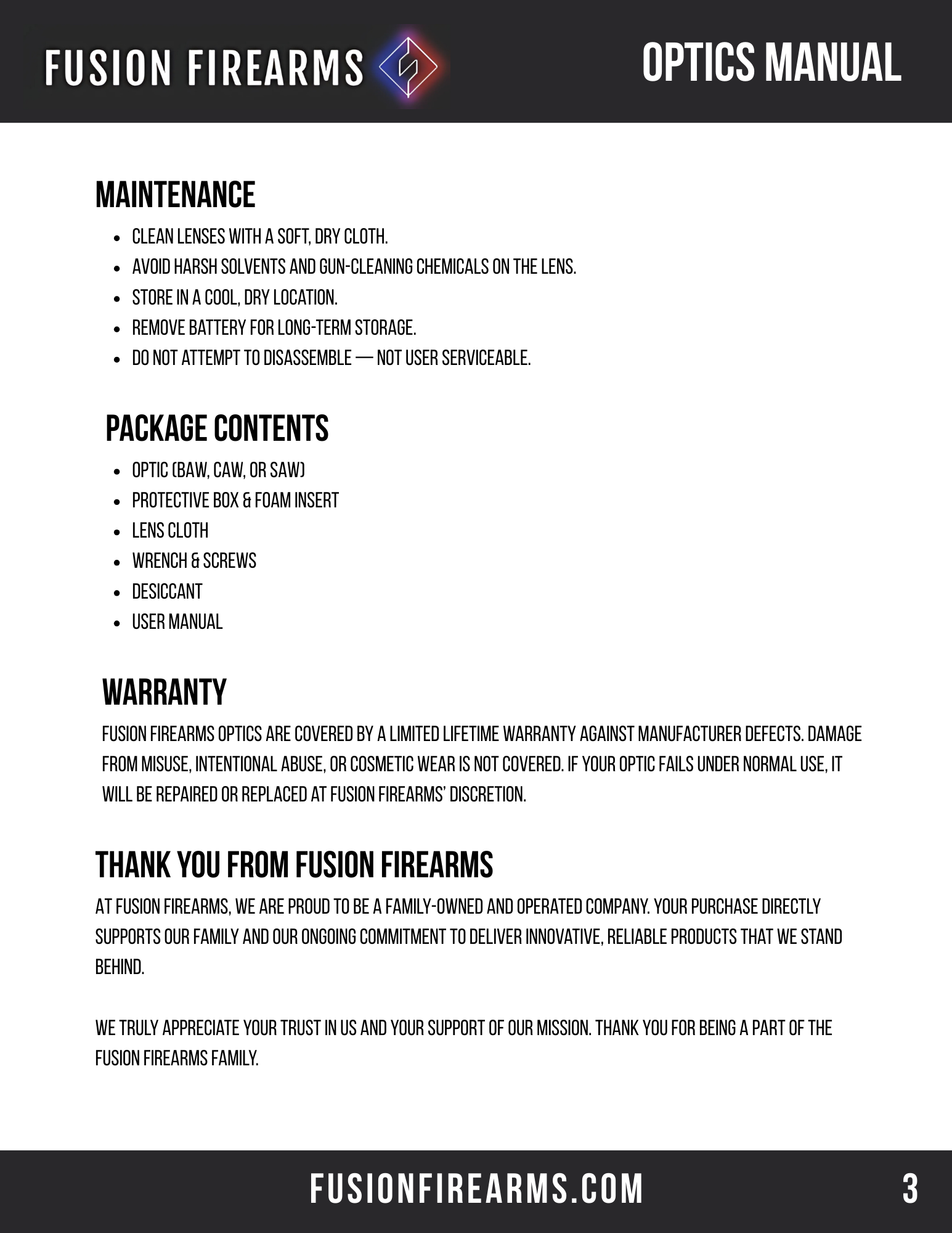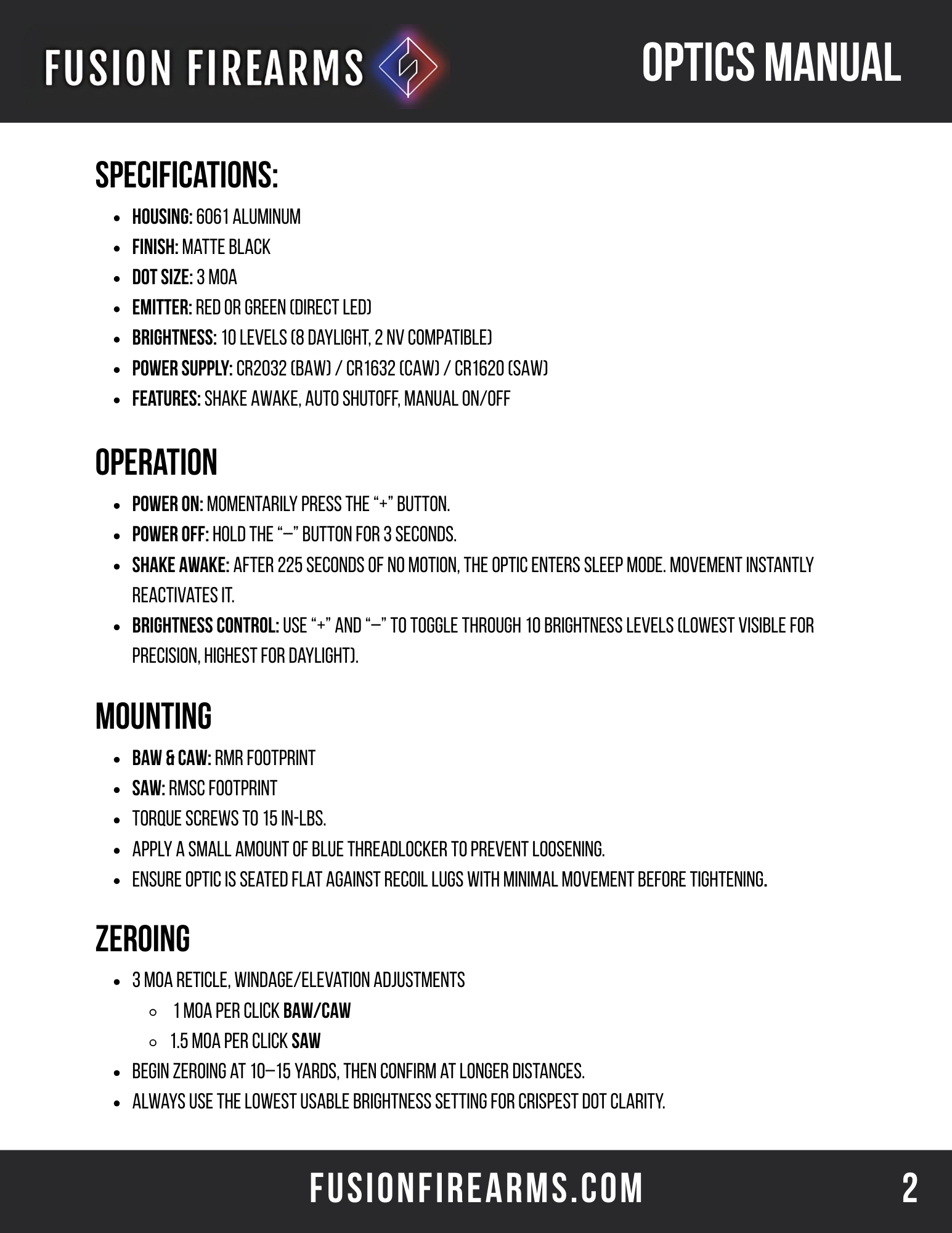 For complete instructions on setup, operation, zeroing, and maintenance, you can download the full Fusion Firearms Optics Manual using the link below: