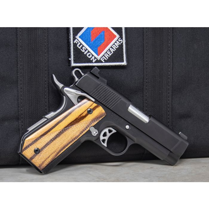 This Fusion Custom Shop Built 1911 is a 70 Series pistol hand crafted with all of the highest-end, Fusion Pro Line Components. The N-Comm is an Officers Slide fitted to a Commander frame and uses all standard 1911 parts, and standard full size 1911 magazines. The Black Shield finish is our most durable, “Rugged-Duty” finish, and the brushed stainless steel accent parts gives the pistol a classy and distinctive look. For sighting, it is topped with are non-glare fancy fine top serrations with reveal and the sight set-up is our most popular combat “U-notch” rear and XS white dot with tritium front. This sight set-up is for fast acquisition and confirmed targeting in all light conditions. The pistol is completely hand de-horned for carry comfort.