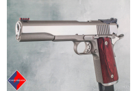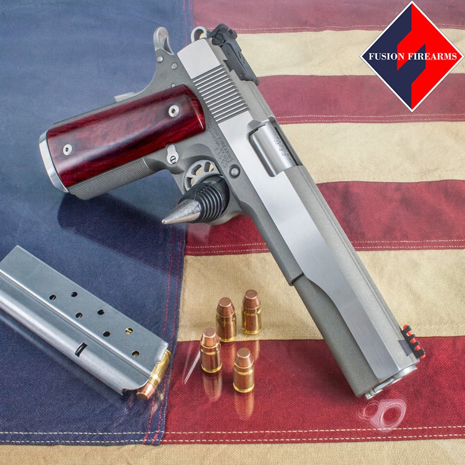 Hi Folks, What’s for lunch today on the Fusion Firearms Custom shop Bench??? How About a custom Shop Pro-Series Elite, Long-Slide 1911 in 357 SIG. The foundation of this finely crafted pistol is a Fusion Pro-Series Forged Stainless steel Frame, stainless steel Slide, and Fusion match stainless 357 Sig, 6 inch barrel, Flush-cut and target crowned. The slide stop, hammer and mag-catch are finished in Brushed polished stainless steel. The Slide is topped off with our Fancy fine top slide serrations with reveal and fully adjustable Bomar style sight set. Other Options; Mag-Well Mainspring housing, Checkered front and back-strap, Countersunk Slide stop hole & flush-cut slide stop pin in frame, Full length guide rod system and then stocked with some of our Fusion “Hand Select” AAA+ grade, Ranger Checkered, white cocobolo. The Pistol is also completely dehorned, tested, tuned and reliability job included. Trigger is set at a clean & crisp 3,75 pound trigger pull. MADE IN THE USA … Venice Florida….. Fusion’s HQ….