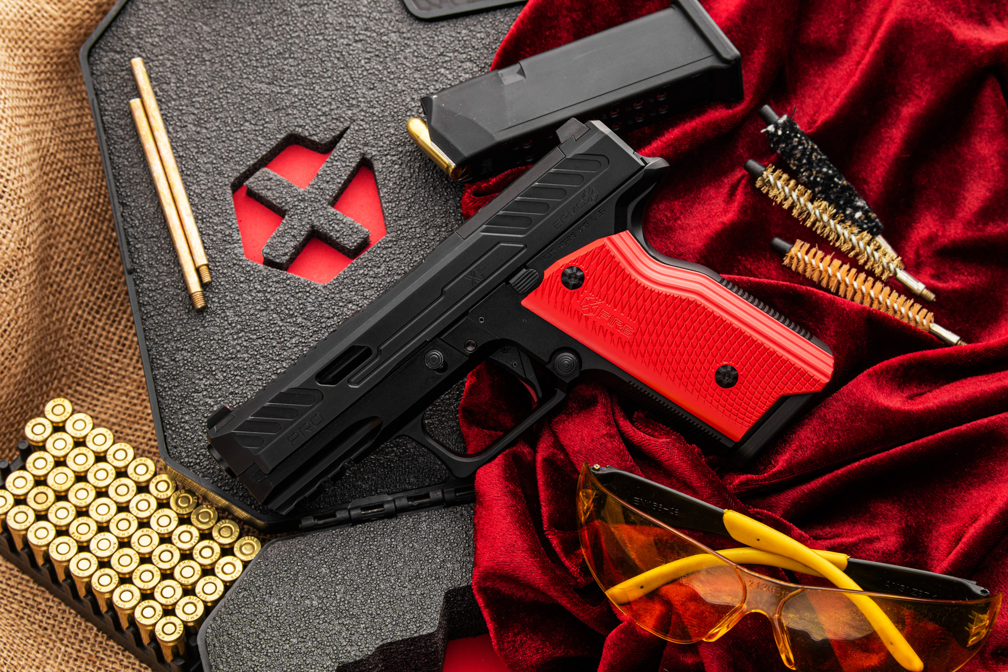 Constructed from premium bar-stock materials and precision CNC machined, the XF PRO™ ensures unmatched durability and precision. The aluminum frame, featuring a tactical rail and Sure Grip checkering, provides a solid and ergonomic platform, while the interchangeable grip panels with black and red included, offering a customizable shooting experience.